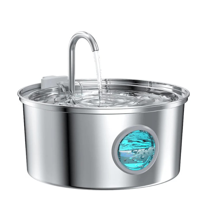 Dispenser apa automat tip fantana pentru pisici si caini, cu fereastra mare pentru nivelul apei, purificare si filtrare prin carbune activ, otel inoxidabil 304, ultra-silentiosa, USB, adaptor priza, model rotund, capacitate 3.2L, Argintiu